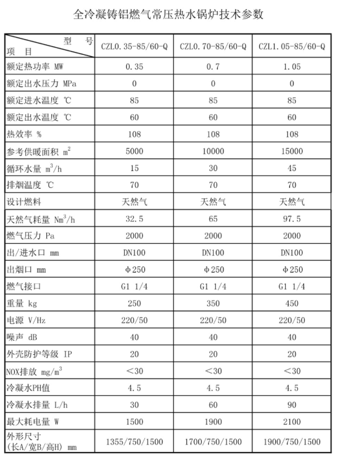全預(yù)混低氮冷凝鑄鋁燃?xì)忮仩t源自歐洲,氮氧化物排放低于30mg/m3,優(yōu)于 嚴(yán)環(huán)保標(biāo)準(zhǔn)。排煙溫度接近回水溫度, 低可至35℃,選用PVC煙管。綜合節(jié)能40%以上,變頻輸出的調(diào)節(jié)范圍從15%~ ,使熱量輸出更加 。采用世界 的水、火逆流結(jié)構(gòu)設(shè)計,熱效率高,體積小,采用輪式底座,運輸方便,能使鍋爐安裝在房間,節(jié)省鍋爐房面積。1噸冷凝燃?xì)忮仩t占地面積僅2m2,供暖面積可達(dá)10000 m2。